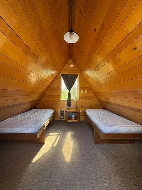Our standard A-frame cabin packs 168 square feet of cozy charm. Inside, you’ll find two twin beds, a comfy chair, bottled water, linens, books, and an end table—everything you need for a relaxing stay. Heating and cooling keep things comfortable, and there’s onsite garbage plus a portable toilet for convenience.